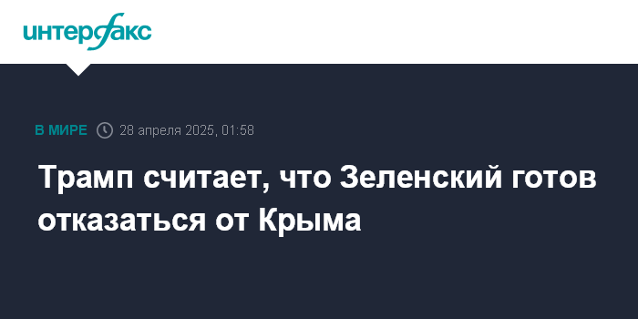 Москва. 28 апреля. INTERFAX.RU - Президент Украины Владимир Зеленский готов отказаться от притязаний на Крым, такое мнение выразил американский лидер Дональд Трамп после встречи с ним в Ватикане.
