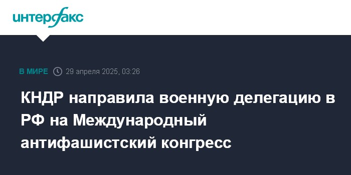 Москва. 29 апреля. INTERFAX.RU - Военная делегация Северной Кореи отправилась в Россию для участия в III Международном антифашистском конгрессе, сообщает ЦТАК.