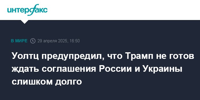 Москва. 29 апреля. INTERFAX.RU - Москве и Киеву следует как можно скорее добиться соглашения об украинском урегулировании, президент США Дональд Трамп не собирается мириться с чрезмерным затягиванием дипломатического процесса, предупредил советник президента по нацбезопасности Майк Уолтц.