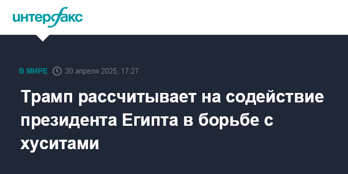 Москва. 30 апреля. INTERFAX.RU - Президент США Дональд Трамп провел телефонный разговор с египетским президентом Абделем Фаттахом ас-Сиси и сообщил ему, что США рассчитывают на помощь Египта в борьбе с хуситами, пишет The Wall Street Journal.