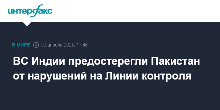 Москва. 30 апреля. INTERFAX.RU - Военные Индии и Пакистана 29 апреля провели переговоры по линии экстренной связи, индийская сторона предупредила Исламабад о недопустимости нарушения режима прекращения огня на Линии контроля - демаркационной линии между странами, сообщает ANI со ссылкой на источники.