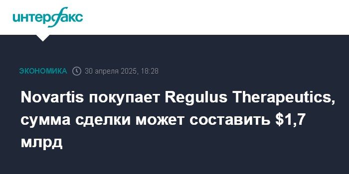 Москва. 30 апреля. INTERFAX.RU - Швейцарская фармацевтическая компания Novartis AG сообщила, что покупает американскую Regulus Therapeutics, которая специализируется на разработке терапевтических средств на основе микроРНК.