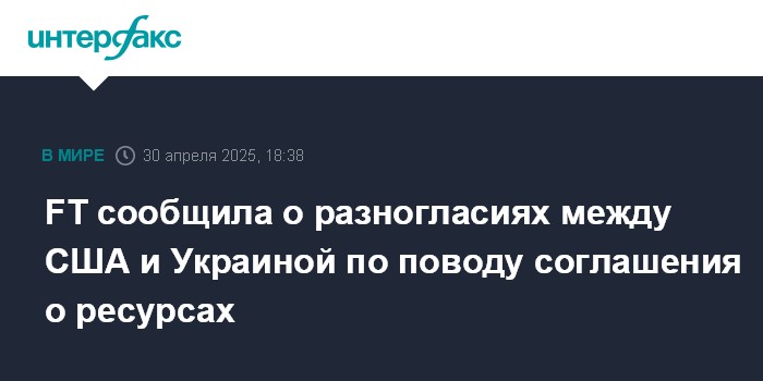 Москва. 30 апреля. INTERFAX.RU - У властей США и Украины, которые готовились к скорому подписанию соглашения по ресурсам, в среду возникли серьезные разногласия, сообщает Financial Times (FT).