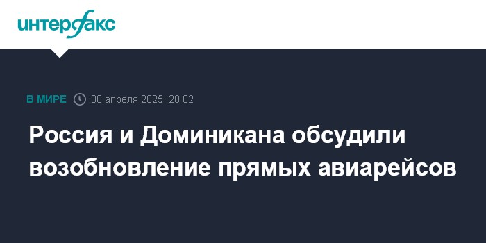 Москва. 30 апреля. INTERFAX.RU - Россия и Доминиканская Республика договорились способствовать наращиванию взаимного туристического потока, в том числе возобновлению прямых авиарейсов, сообщил глава МИД РФ Сергей Лавров.