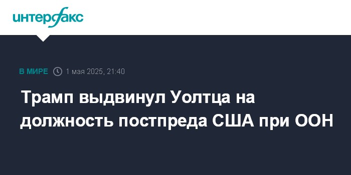 Москва. 1 мая. INTERFAX.RU - Президент США Дональд Трамп заявил, что его советник по нацбезопасности Майк Уолтц покинет свой пост и станет претендентом на должность постпреда при ООН.