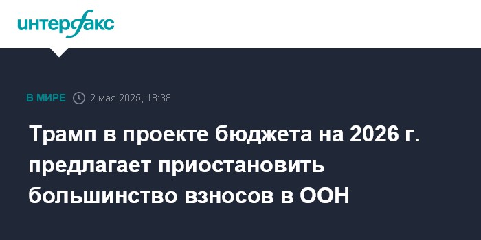 Москва. 2 мая. INTERFAX.RU - Президент США Дональд Трамп в рамках проекта бюджета на 2026 финансовый год предлагает приостановить значительную часть взносов в ООН и другие международные организации, свидетельствует опубликованный в пятницу Белым домом документ.