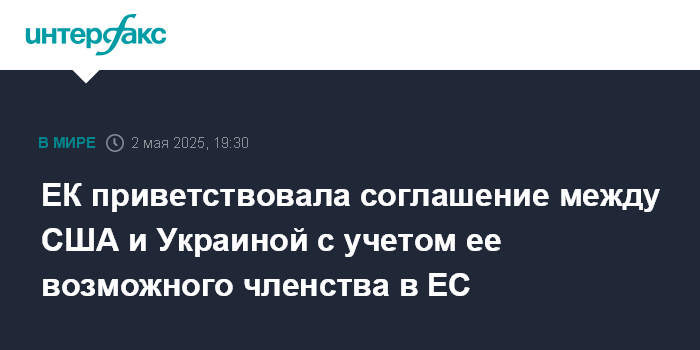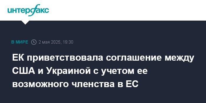 Москва. 2 мая. INTERFAX.RU - В Еврокомиссии (ЕК) позитивно оценили, что в тексте американо-украинского соглашения об учреждении инвестиционного фонда по восстановлению Украины учтен процесс вступления этой страны в Европейский союз.