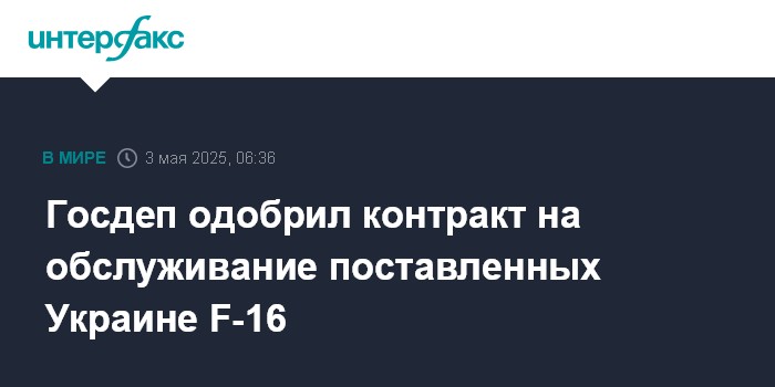 Москва. 3 мая. INTERFAX.RU - Госдепартамент США одобрил контракт на предоставление Украине услуг по обслуживанию поставленных Киеву истребителей F-16 на сумму $310,5 млн, сообщило агентство оборонного сотрудничества американского Минобороны.