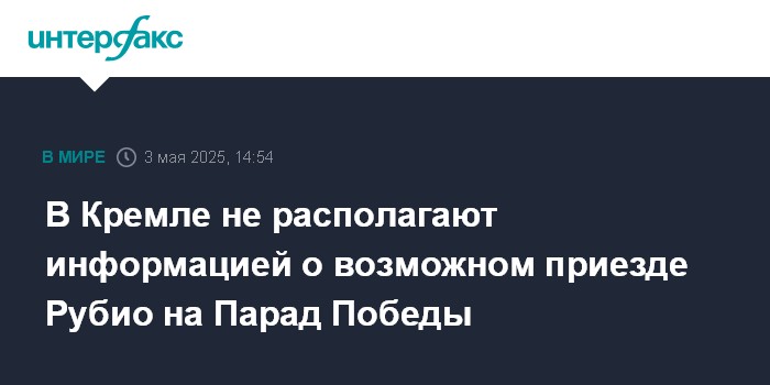 Москва. 3 мая. INTERFAX.RU - Пресс-секретарь президента РФ Дмитрий Песков заявил, что не располагает информацией о том, что Парад Победы в Москве 9 мая посетит госсекретарь США Марко Рубио.