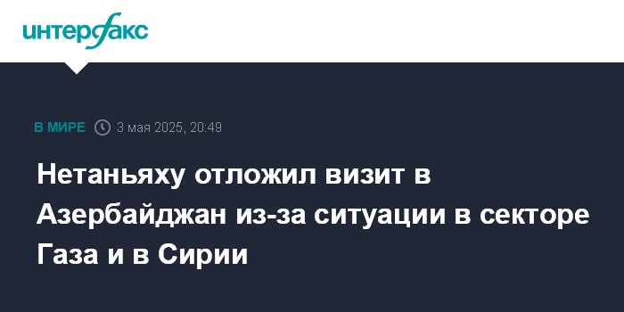 Москва. 3 мая. INTERFAX.RU - Премьер-министр Израиля Биньямин Нетаньяху принял решение отложить свой визит в Азербайджан, запланированный на 7-11 мая, в связи с событиями в регионе, сообщила канцелярия премьера.