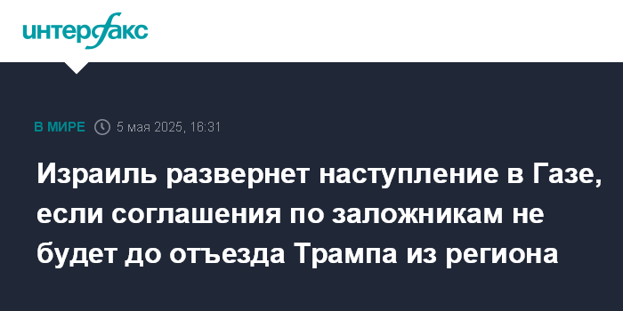 Москва. 5 мая. INTERFAX.RU - Армия обороны Израиля (ЦАХАЛ) развернет наступление в секторе Газа, если с группировкой ХАМАС не удастся заключить соглашение по заложникам до конца поездки президента США Дональда Трампа по региону с 13 по 16 мая, передает The Times of Israel со ссылкой на источник.