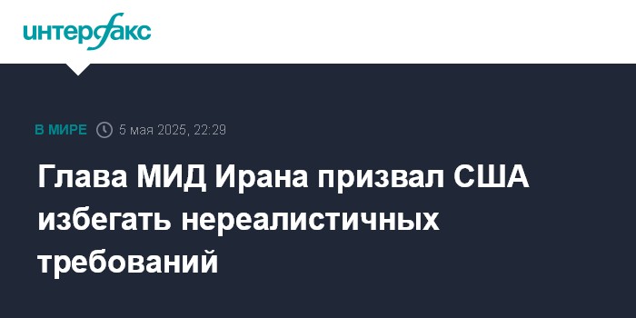 Москва. 5 мая. INTERFAX.RU - Министр иностранных дел Ирана Аббас Аракчи призвал в понедельник Соединенные Штаты избегать нереалистичных требований в момент, когда две враждующие страны вступили в деликатные переговоры об иранском атоме, сообщает Le Figaro.