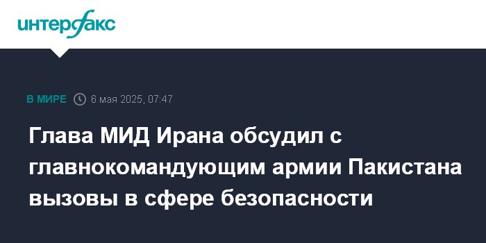Москва. 6 мая. INTERFAX.RU - Министр иностранных дел Ирана Аббас Аракчи на фоне напряженности между Индией и Пакистаном обсудил обстановку в регионе с главнокомандующим армии Пакистана генералом Сайедом Асимом Муниром, передает агентство ИРНА.
