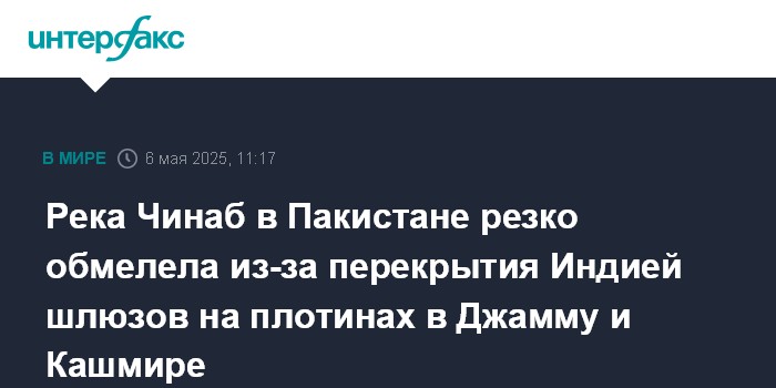 Москва. 6 мая. INTERFAX.RU - Река Чинаб, которая протекает из Индии в Пакистан, резко обмелела после того, как индийские власти в связи с напряженностью между Дели и Исламабадом закрыли шлюзы на плотинах на союзной территории Джамму и Кашмир, сообщает во вторник The Times of India.