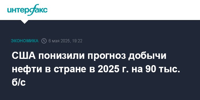 Москва. 6 мая. INTERFAX.RU - Минэнерго США понизило прогноз добычи нефти в стране (без учета других жидких углеводородов) в 2025 году на 90 тыс. баррелей в сутки (б/с): с 13,51 млн б/с до 13,42 млн б/с, говорится в ежемесячном прогнозе управления энергетической информации (EIA) Минэнерго.