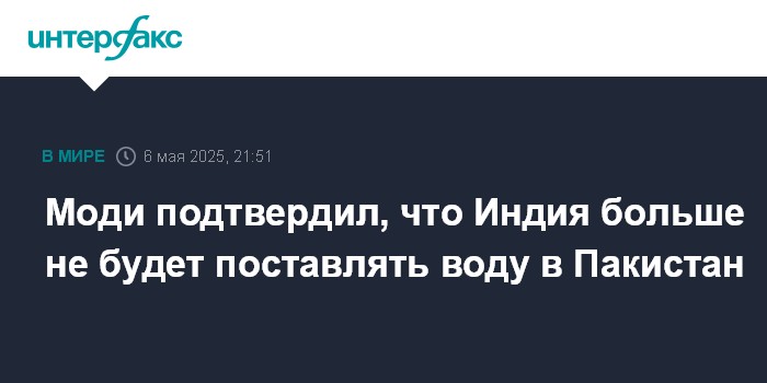 Москва. 6 мая. INTERFAX.RU - Премьер-министр Индии Нарендра Моди заявил, что Индия прекратила подачу речной воды в Пакистан, сообщают индийские СМИ.