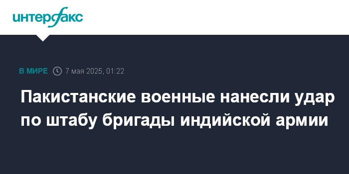 Москва. 7 мая. INTERFAX.RU - Армия Пакистана нанесла удар по штабу одной из бригад индийской армии, сообщает в ночь на среду телеканал PTV.