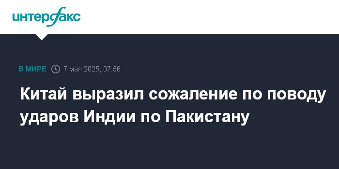 Москва. 7 мая. INTERFAX.RU - Представитель МИД КНР заявил в среду, что Китай обеспокоен обострением отношений между Индией и Пакистаном, а также выразил сожаление в связи с ударами индийских ВВС по объектам в Пакистане.