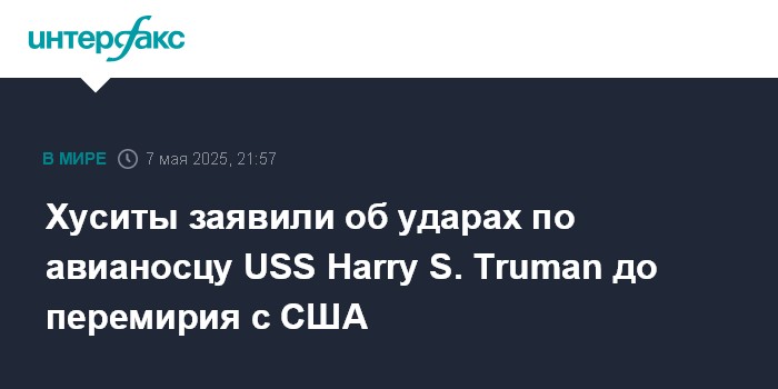 Москва. 7 мая. INTERFAX.RU - Йеменские хуситы утверждают, что до вступления в силу договоренностей о прекращении огня с США успели нанести удары по авианосцу USS Harry S. Truman и американским кораблям в Красном море.
