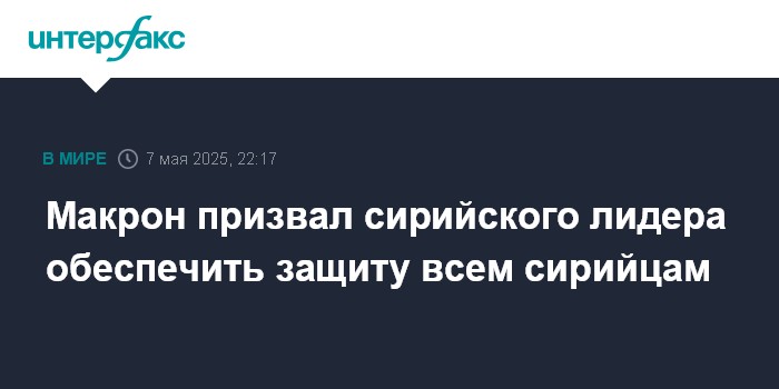 Москва. 7 мая. INTERFAX.RU - Президент Франции Эммануэль Макрон, принимая в среду в Париже президента Сирии в переходный период Ахмеда аш-Шараа, призвал его сделать все, чтобы обеспечить защиту всех сирийцев без исключения, сообщает телеканал BFMTV.