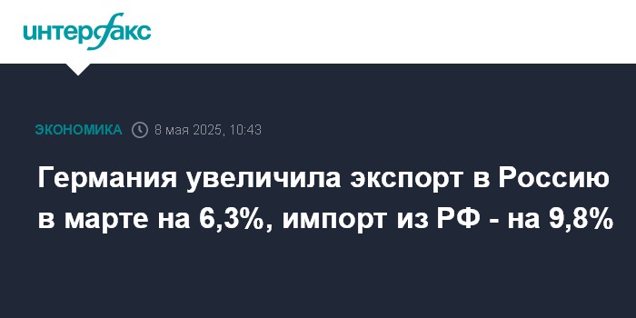 Москва. 8 мая. INTERFAX.RU - Германия увеличила экспорт в Россию в марте на 6,3% по сравнению с февралем - до 641,091 млн евро с 610,903 млн евро, говорится в отчете Федерального статистического управления ФРГ (Destatis).