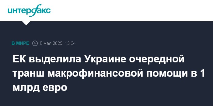Москва. 8 мая. INTERFAX.RU - Европейская комиссия (ЕК) объявила в четверг о выделении Украине четвертого транша своего кредита макрофинансовой помощи (МФП) в размере 1 млрд евро.