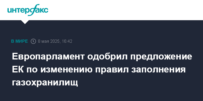 Москва. 8 мая. INTERFAX.RU - Европарламент (ЕП) одобрил в четверг законопроект, направленный на снижение цен на газ путем введения большей гибкости в правилах заполнения газовых хранилищ, сообщила пресс-служба ЕП.