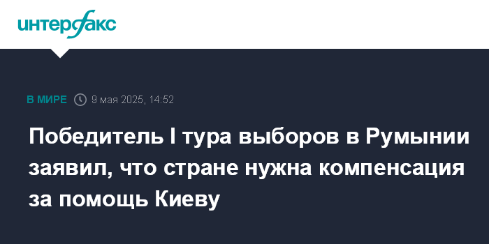 Москва. 9 мая. INTERFAX.RU - Глава ультраправой партии "Альянс за единство румын" Джордже Симион, победивший в первом туре президентских выборов, заявил, что Румыния должна получить компенсацию за оказанную Украине помощь.