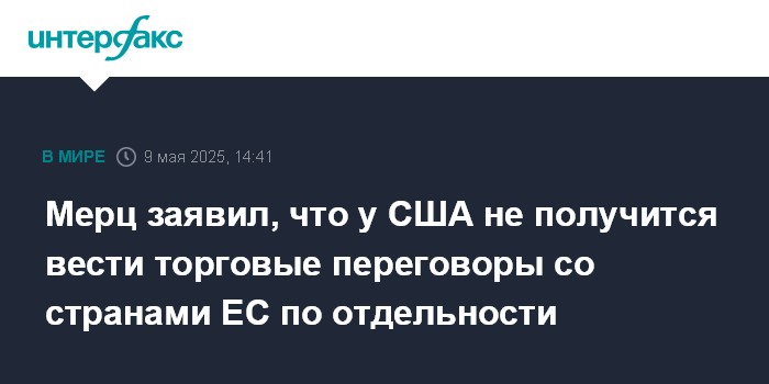Москва. 9 мая. INTERFAX.RU - Канцлер ФРГ Фридрих Мерц заявил, что в недавнем разговоре с президентом США Дональдом Трампом он объяснил отсутствие возможности для Вашингтона обсуждать торговые вопросы с отдельными членами Евросоюза, а не со всем союзом сразу.