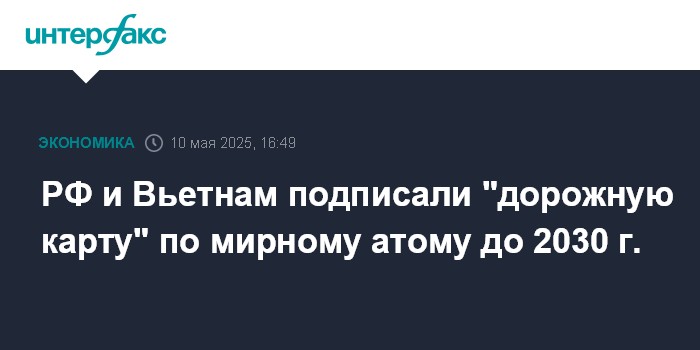 Москва. 10 мая. INTERFAX.RU - Госкорпорация "Росатом" подписала "дорожную карту" по развитию мирного атома во Вьетнаме на 2025-2030 годы, соответствующую церемонию обмена документами показал телеканал "Россия-24".