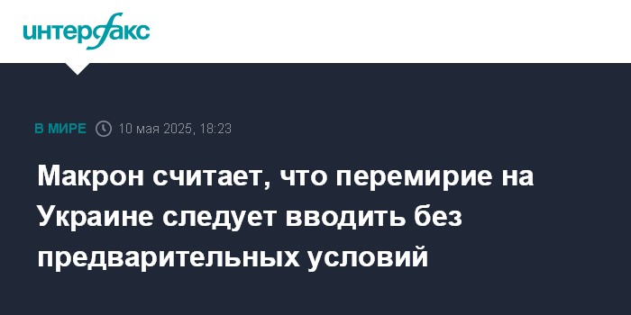 Москва. 10 мая. INTERFAX.RU - Предлагаемое Западом 30-дневное перемирие на Украине должно выполняться без каких бы то ни было предварительных условий, заявил в субботу президент Франции Эммануэль Макрон.