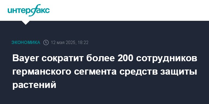 Москва. 12 мая. INTERFAX.RU - Германская фармацевтическая и химическая Bayer планирует сократить более 200 сотрудников в рамках реструктуризации сегмента средств защиты растений в Германии, сообщила компания.