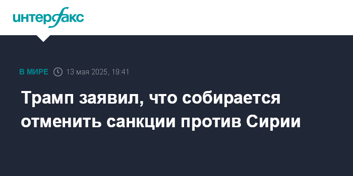 Москва. 13 мая. INTERFAX.RU - Президент США Дональд Трамп во вторник заявил, что он намерен отдать распоряжение об отмене санкций в отношении Сирии.