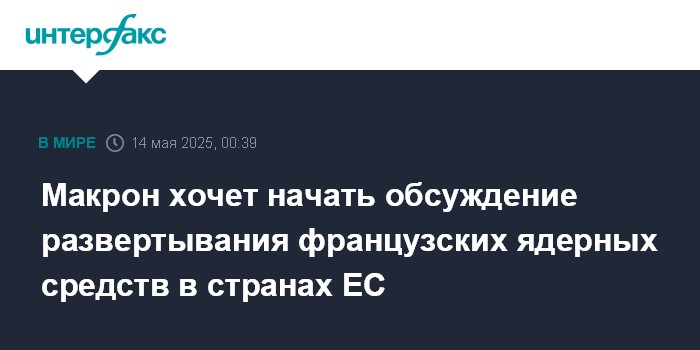 Москва. 14 мая. INTERFAX.RU - Президент Франции Эммануэль Макрон заявил о готовности "приступить к дискуссии" о развертывании французских военных самолетов, снаряженных ядерным оружием, в странах Евросоюза.