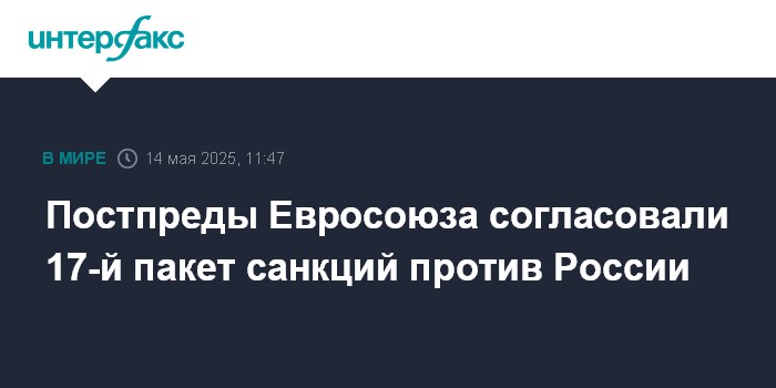 Москва. 14 мая. INTERFAX.RU - Постпреды стран Евросоюза согласовали новый, 17-й пакет санкций против, сообщил в соцсети председатель Европейского совета Антониу Кошта.