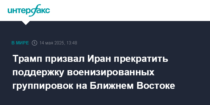 Москва. 14 мая. INTERFAX.RU - Президент США Дональд Трамп призвал Иран прекратить поддержку военизированных группировок в ближневосточном регионе для достижения соглашения о нормализации отношений с Вашингтоном, сообщает в среду Associated Press (AP).