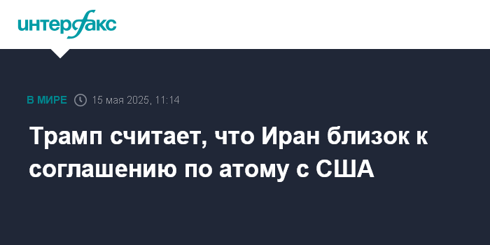 Москва. 15 мая. INTERFAX.RU - Иран близок к тому, чтобы заключить соглашение с США по ядерному вопросу, заявил в четверг президент США Дональд Трамп.