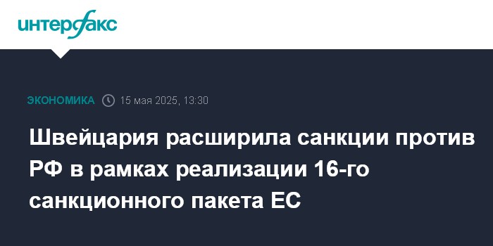 Москва. 15 мая. INTERFAX.RU - Швейцария присоединяется ко всем мерам 16-го пакета санкций Европейского союза в отношении России, сообщила пресс-служба швейцарского Федерального совета.