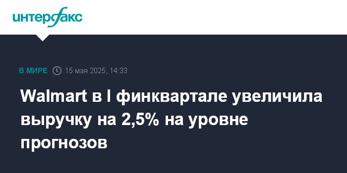 Москва. 15 мая. INTERFAX.RU - Американская Walmart Inc., крупнейшая в стране компания розничной торговли, увеличила выручку на 2,5% в первом финансовом квартале и сократила чистую прибыль на 12%, а также подтвердила прогнозы на текущий фингод.