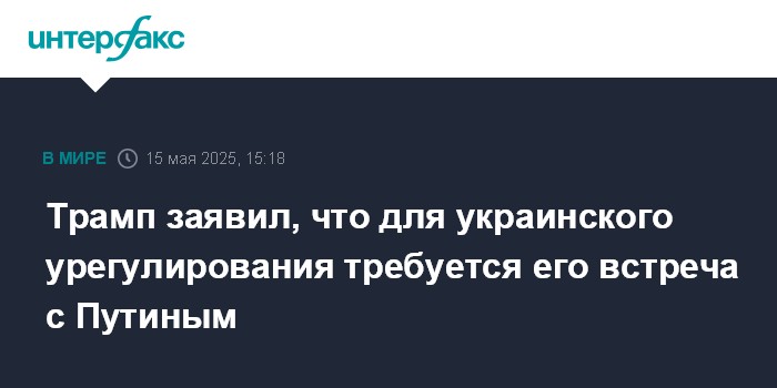 Москва. 15 мая. INTERFAX.RU - Президент США Дональд Трамп в четверг заявил, что для урегулирования конфликта на Украине необходима его личная встреча с президентом России Владимиром Путиным.