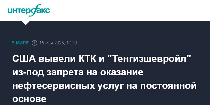 Москва. 15 мая. INTERFAX.RU - Министерство финансов США сделало постоянно действующим разрешение на оказание нефтесервисных услуг "Каспийскому трубопроводному консорциуму" (КТК) и "Тенгизшевройлу", закрепляющее исключение из действующих санкционных запретов.