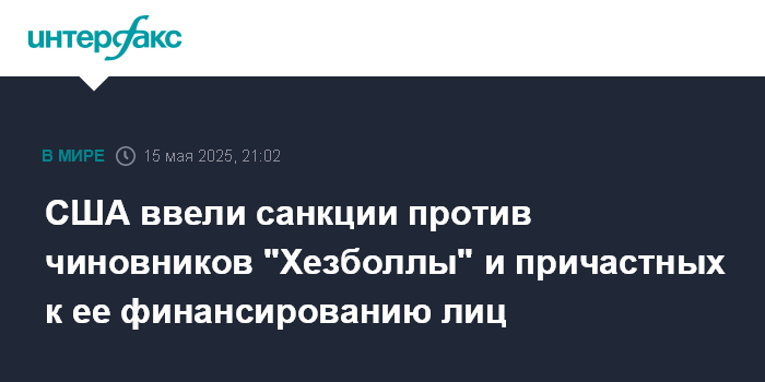 Москва. 15 мая. INTERFAX.RU - Вашингтон ввел санкции в отношении ряда высокопоставленных лиц движения "Хезболла" и тех, кто принимает участие в его финансировании, сообщает в четверг госдеп США.