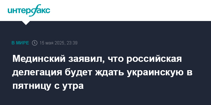 Москва. 15 мая. INTERFAX.RU - Россия будет ждать представителей Украины для переговоров в пятницу с 10:00, заявил глава российской делегации Владимир Мединский.