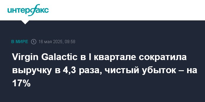 Москва. 16 мая. INTERFAX.RU - Аэрокосмическая компания британского миллиардера Ричарда Брэнсона Virgin Galactic в первом квартале сократила выручку в 4,3 раза и уменьшила убыток на 17%, при этом ее выручка оказалась лучше прогноза аналитиков.