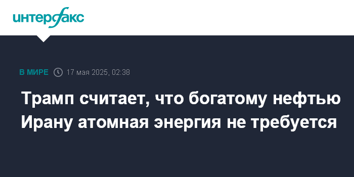 Москва. 17 мая. INTERFAX.RU - Иран обладает большими запасами нефти и газа, и потому не нуждается в мирной ядерной программе, заявил президент США Дональд Трамп.