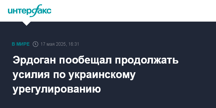 Москва. 17 мая. INTERFAX.RU - Президент Турции Реджеп Тайип Эрдоган пообещал в субботу, что продолжит посреднические усилия для урегулирования украинского кризиса.