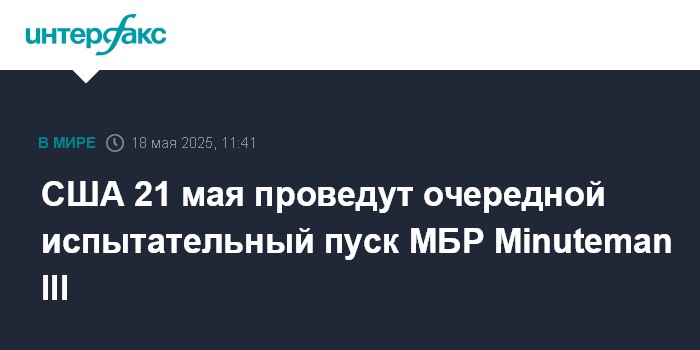 Москва. 18 мая. INTERFAX.RU - Командование глобального удара ВВС США 21 мая проведет испытательный пуск межконтинентальной баллистической ракеты (МБР) Minuteman III на Тихом океане, который позволит подтвердить и проверить эффективность, готовность и точность системы оружия, сообщило командование авиабазы Космических сил Ванденберг в Калифорнии, откуда будет осуществлен запуск.