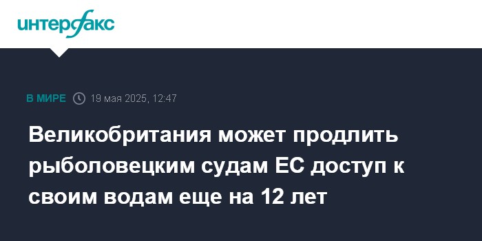 Москва. 19 мая. INTERFAX.RU - Великобритания согласится продлить доступ к своим водам судам из стран Евросоюза для рыбной ловли еще на 12 лет, если ЕС подпишет бессрочный договор об упрощении санитарного и фитосанитарного контроля для экспортируемой британской продукции, пишет Financial Times.