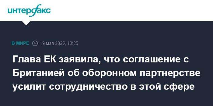 Москва. 19 мая. INTERFAX.RU - Председатель Еврокомиссии (ЕК) Урсула фон дер Ляйен считает, что соглашение ЕС с Великобританией о партнерстве в области безопасности и обороны активизирует сотрудничество сторон в оборонной сфере.