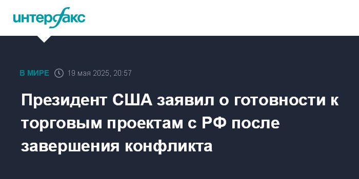 Москва. 19 мая. INTERFAX.RU - Президент США Дональд Трамп заявил, что согласен на крупномасштабные торговые проекты с Россией, которые станут возможными после завершения конфликта на Украине.